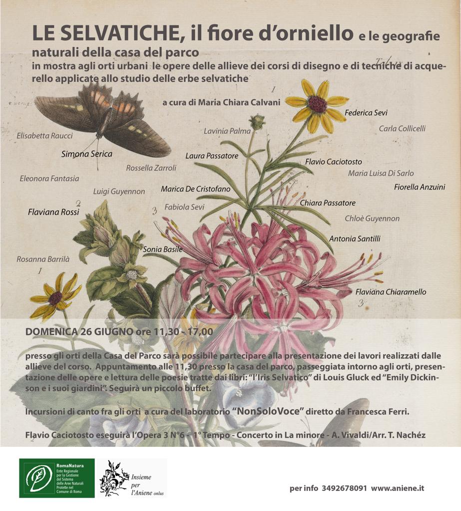 Domenica 26 giugno dalle ore 11,00 alle ore 17,00 presso gli orti della Casa del Parco di Via Vicovaro a Roma sarà possibile partecipare alla giornata di presentazione del laboratorio “Le Selvatiche, il fiore d’orniello e le geografie naturali della casa del parco” tenuto durante l’anno da Maria Chiara Calvani.
